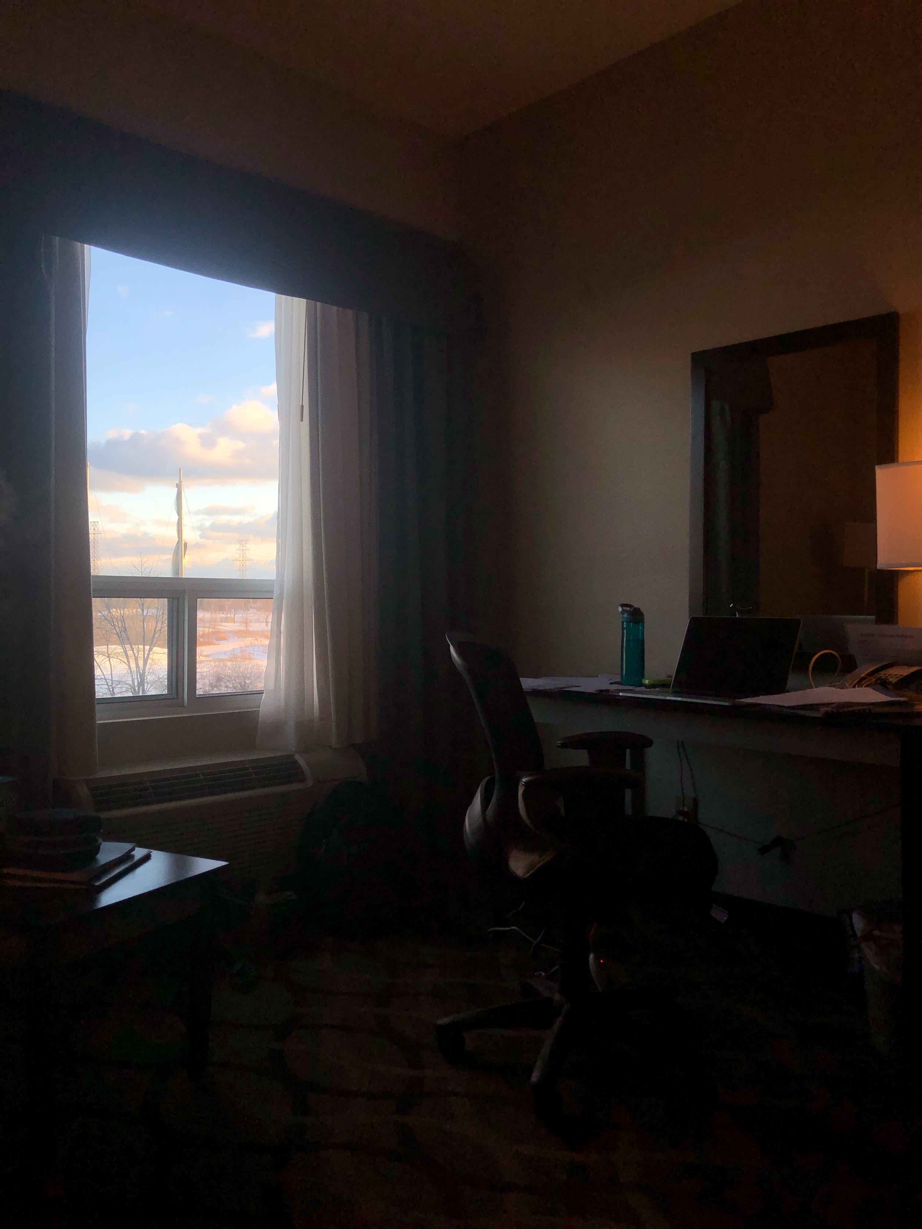 4 — Arena lobby overlooking the rink. Cold, noisy, open to interruptions, but bright and readily available to me as a hockey parent x 3. Grade: C+.